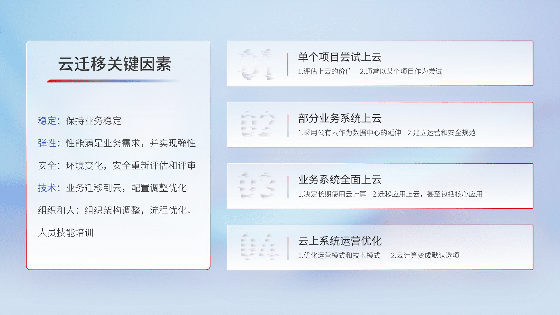 结合实际业务,,,,从规划设计、、、、云平台选型、、、、云原生改造、、数据迁移、、集成交付,,,迁移全过程为客户识别最佳上云路径,,做好风险识别管理,,设计网络架构、、、、身份权限、、、安全审计合规、、操作审计、、、、日志审计、、、、监控告警策略、、、、多站点容灾设计等,,对云上基础设施进行整体规划,,,,提升IT治理水平,,以满足弹性、、高可用、、、、高性能的需求。。