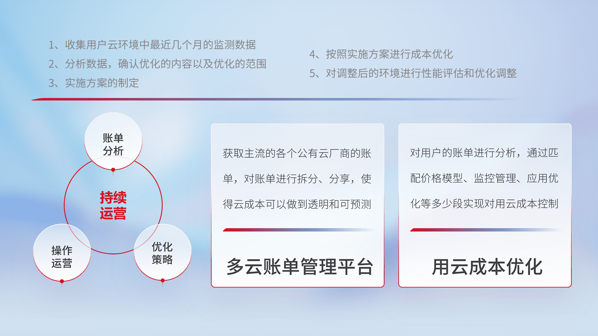 通过多云纳管,,,,以统一的资源数据模型把客户的云资源进行抽象和封装,,,进而实现对多云资源的统一操作,,,,保障云资源管理的可靠性、、、稳定性与可用性。。。量身定制化运维内容,,,配置、、、开发运维、、、补丁管理、、、备份、、、监控、、认证和访问管理、、审计和日常巡检等,,,,保障在用云过程中的可靠度,,,,稳定度以及高可用率。。