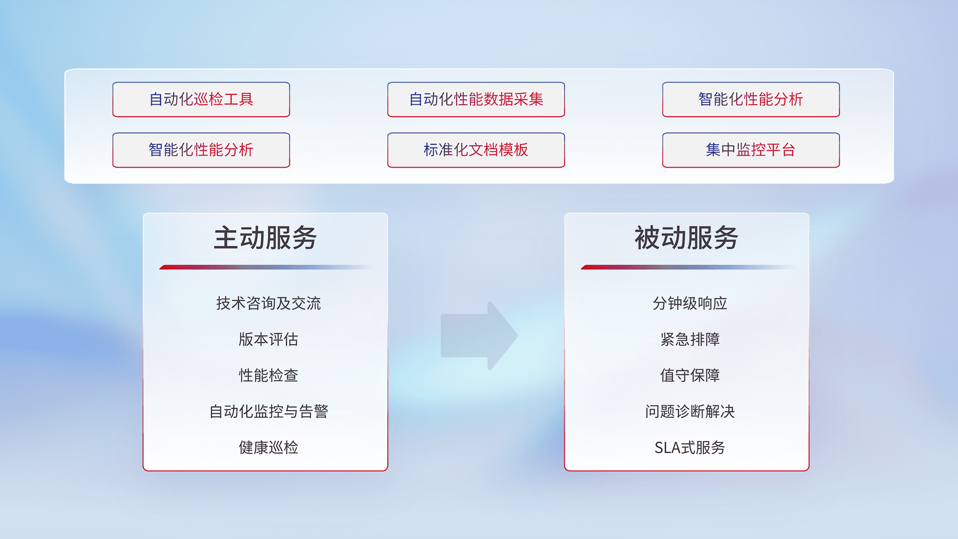 智能化工具和标准化文档,,,,保障服务质量,,提供主动服务(包含技术咨询、、、版本评估、、、、性能检查、、自动化监控与告警、、健康巡检)和被动服务包含(分钟级响应、、紧急排障、、、值守保障、、问题诊断解决、、、SLA服务)。。